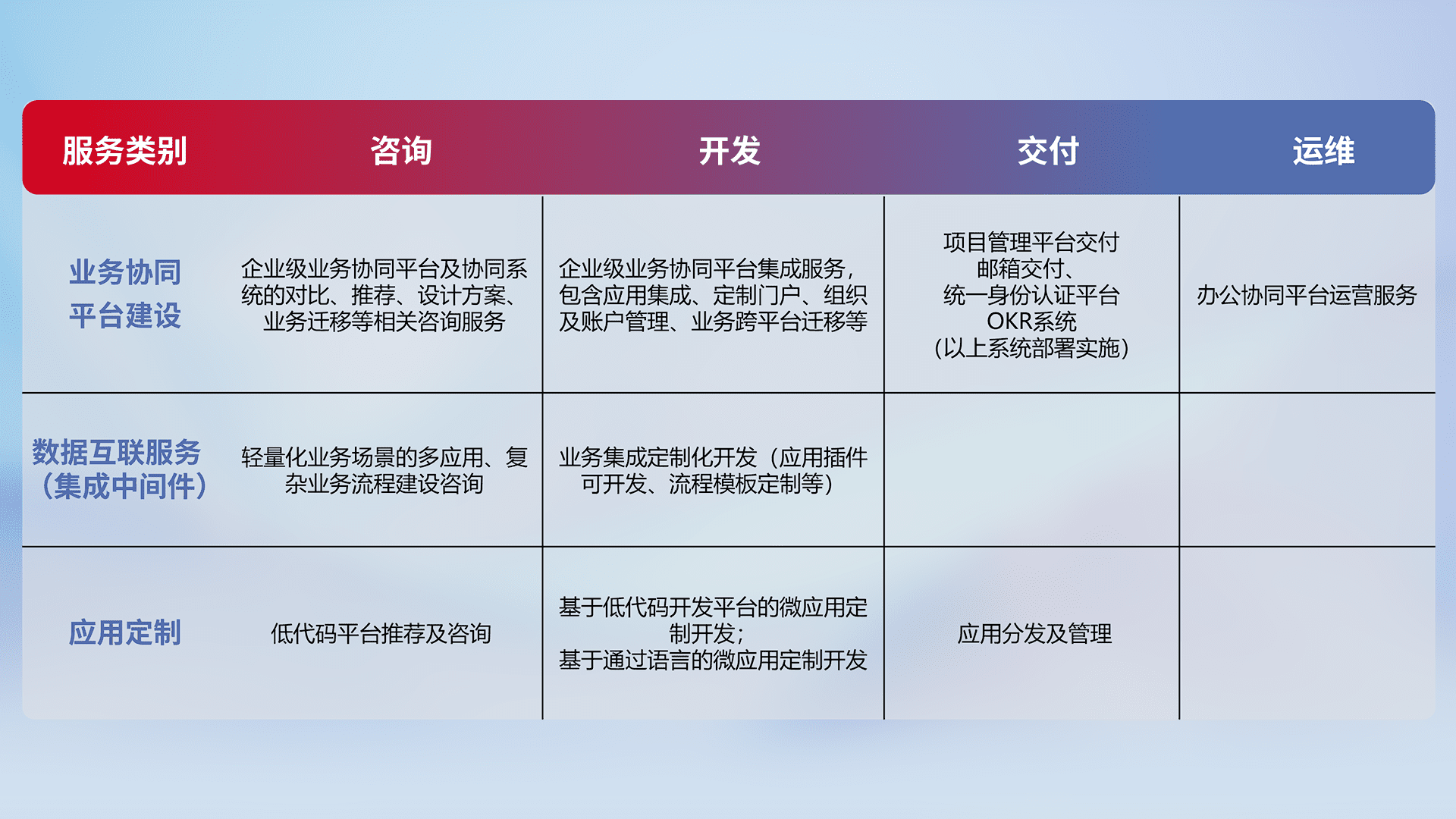 针对钉钉、、、企微、、IDaas等平台级产品提供产品的规划、、、方案、、、、交付、、、定制化开发等服务,,,,实现如统一协同办公、、、、智能客户服务、、、、混合会议管理、、、智能数据查询、、等业务场景,,,实现数字化转型。。。。
